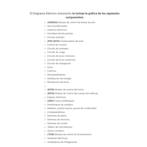 El Diagrama Eléctrico Automotriz te incluye la gráfica de los siguientes componentes: