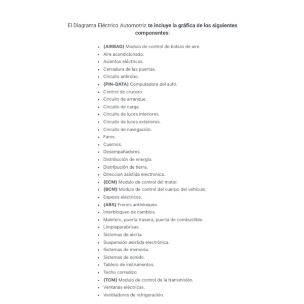 El Diagrama Eléctrico Automotriz te incluye la gráfica de los siguientes componentes: