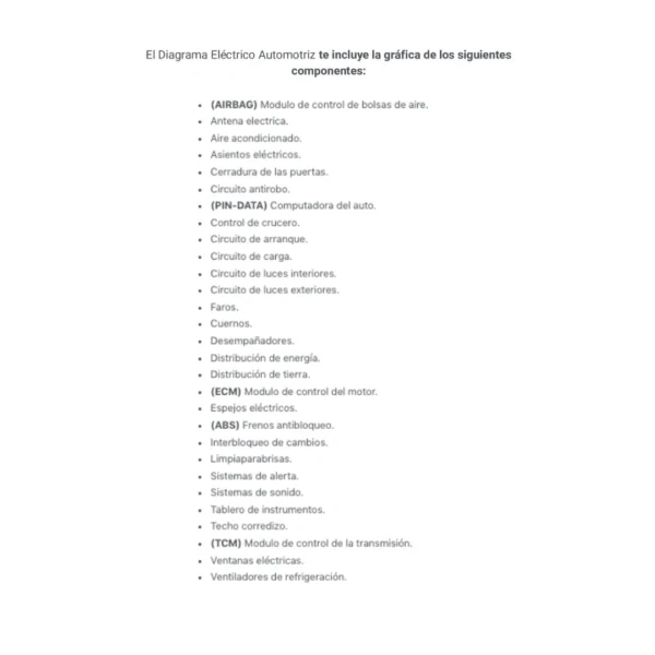 El Diagrama Eléctrico Automotriz te incluye la gráfica de los siguientes componentes: