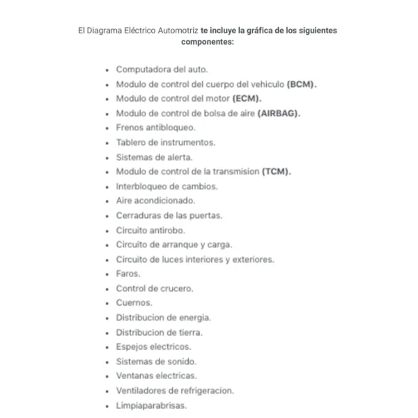 El Diagrama Eléctrico Automotriz te incluye la gráfica de los siguientes componentes: