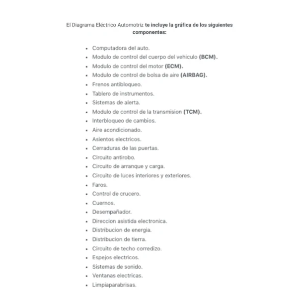 El Diagrama Eléctrico Automotriz te incluye la gráfica de los siguientes componentes: