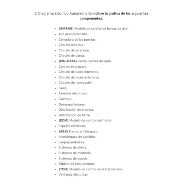 El Diagrama Eléctrico Automotriz te incluye la gráfica de los siguientes componentes: