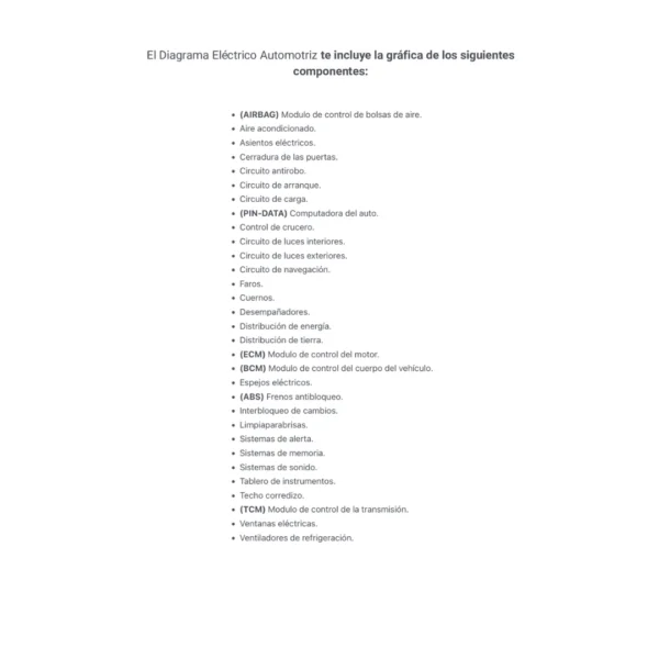 El Diagrama Eléctrico Automotriz te incluye la gráfica de los siguientes componentes: