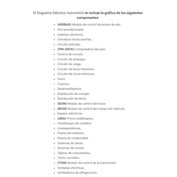 El Diagrama Eléctrico Automotriz te incluye la gráfica de los siguientes componentes: