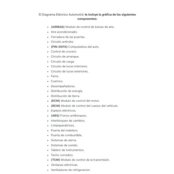 El Diagrama Eléctrico Automotriz te incluye la gráfica de los siguientes componentes: