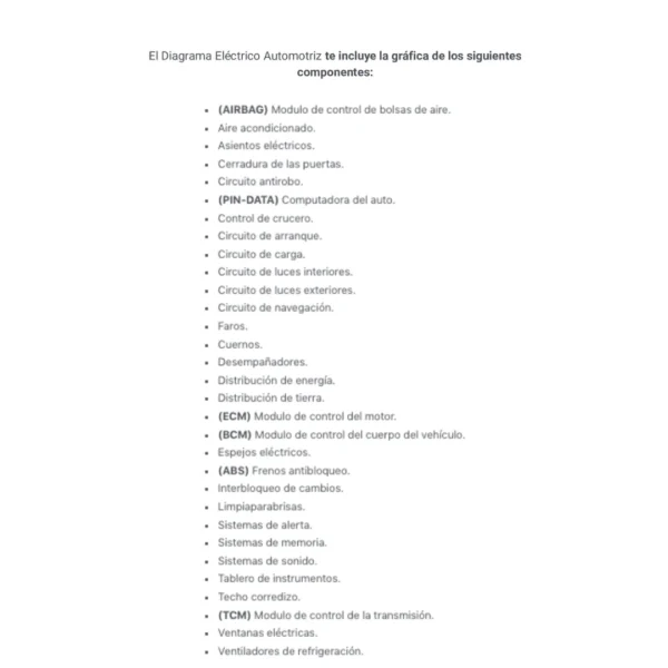 El Diagrama Eléctrico Automotriz te incluye la gráfica de los siguientes componentes: