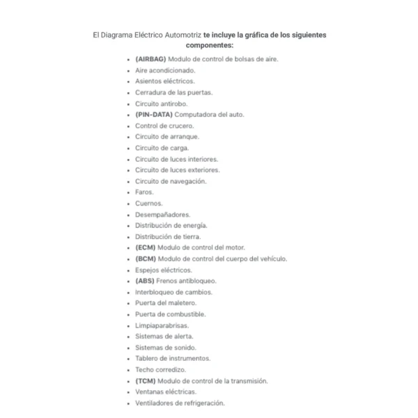 El Diagrama Eléctrico Automotriz te incluye la gráfica de los siguientes componentes: