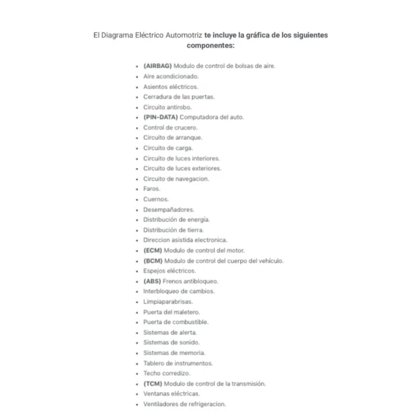 El Diagrama Eléctrico Automotriz te incluye la gráfica de los siguientes componentes: