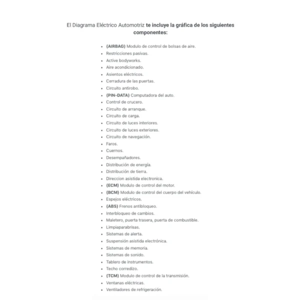 El Diagrama Eléctrico Automotriz te incluye la gráfica de los siguientes componentes:
