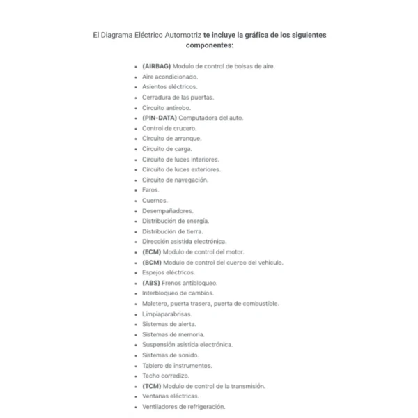 El Diagrama Eléctrico Automotriz te incluye la gráfica de los siguientes componentes: