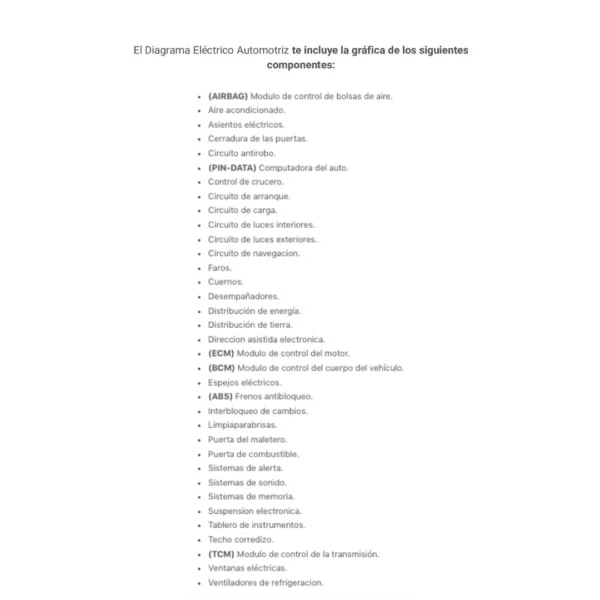 El Diagrama Eléctrico Automotriz te incluye la gráfica de los siguientes componentes:
