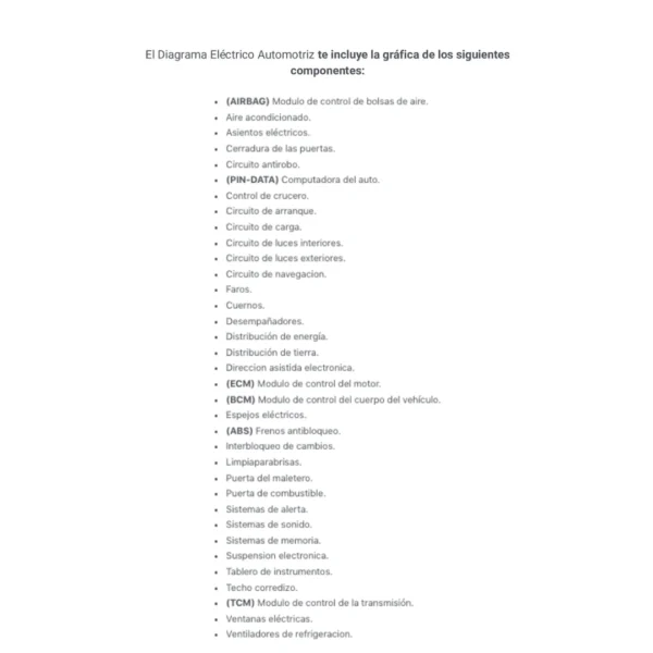 El Diagrama Eléctrico Automotriz te incluye la gráfica de los siguientes componentes: