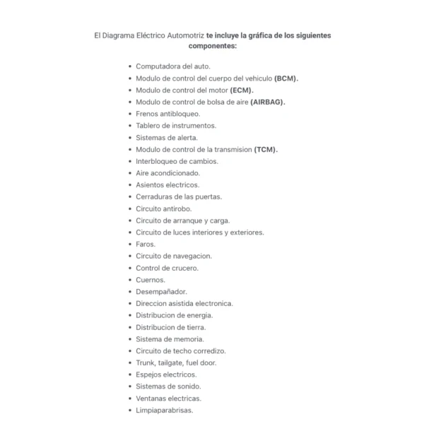 El Diagrama Eléctrico Automotriz te incluye la gráfica de los siguientes componentes: