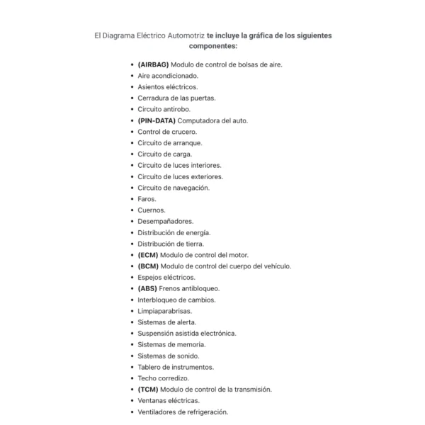 El Diagrama Eléctrico Automotriz te incluye la gráfica de los siguientes componentes: