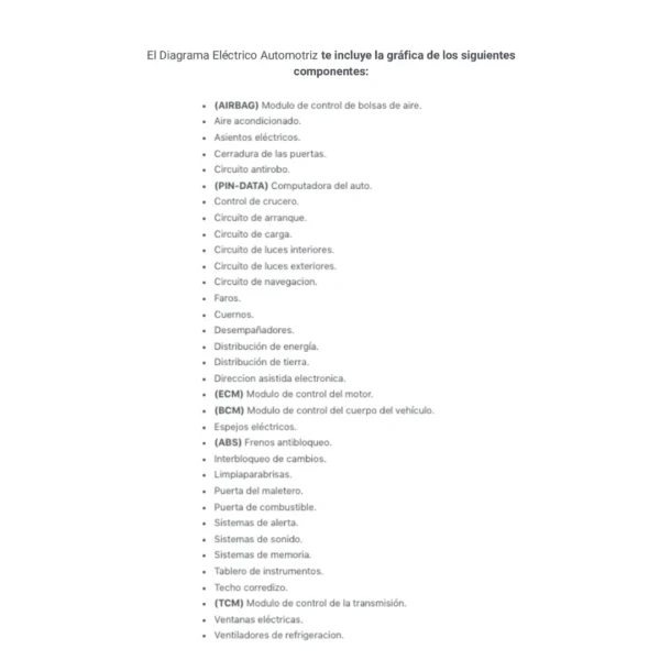 El Diagrama Eléctrico Automotriz te incluye la gráfica de los siguientes componentes:
