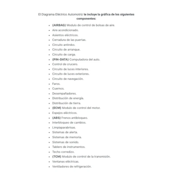 El Diagrama Eléctrico Automotriz te incluye la gráfica de los siguientes componentes:
