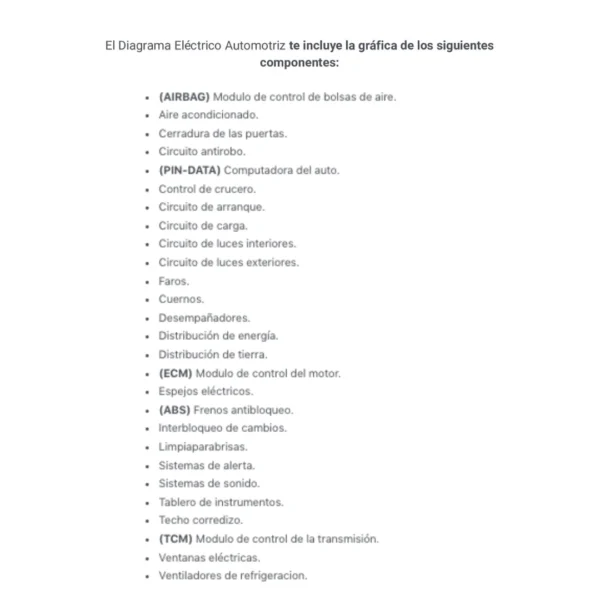 El Diagrama Eléctrico Automotriz te incluye la gráfica de los siguientes componentes: