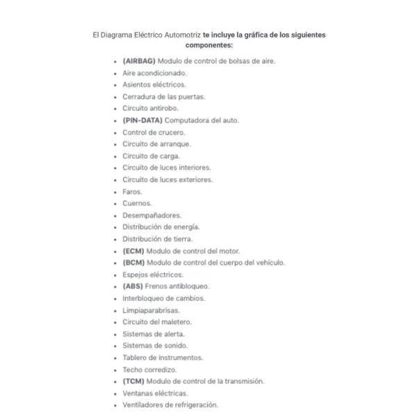El Diagrama Eléctrico Automotriz te incluye la gráfica de los siguientes componentes: