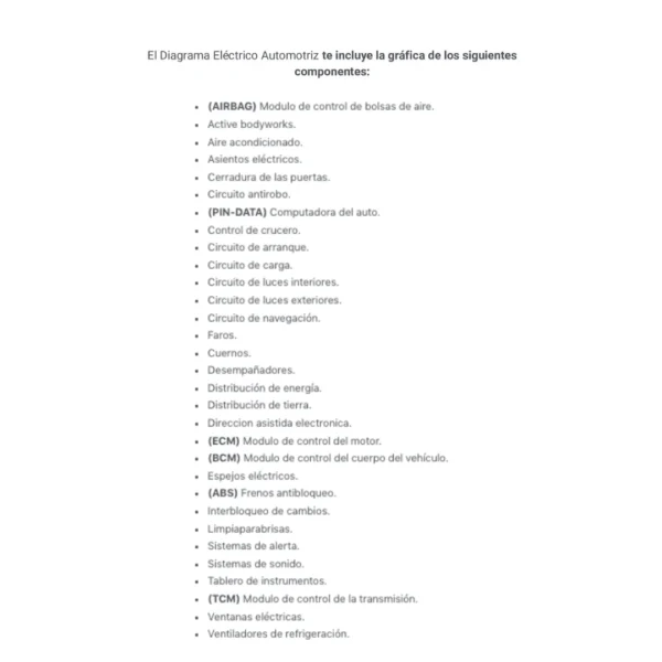 El Diagrama Eléctrico Automotriz te incluye la gráfica de los siguientes componentes: