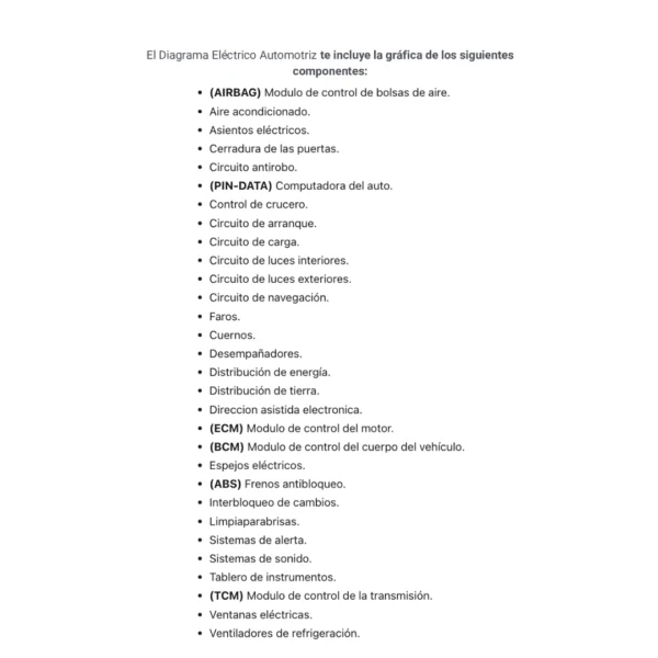 El Diagrama Eléctrico Automotriz te incluye la gráfica de los siguientes componentes: