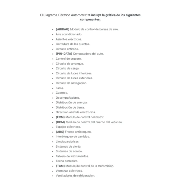 El Diagrama Eléctrico Automotriz te incluye la gráfica de los siguientes componentes: