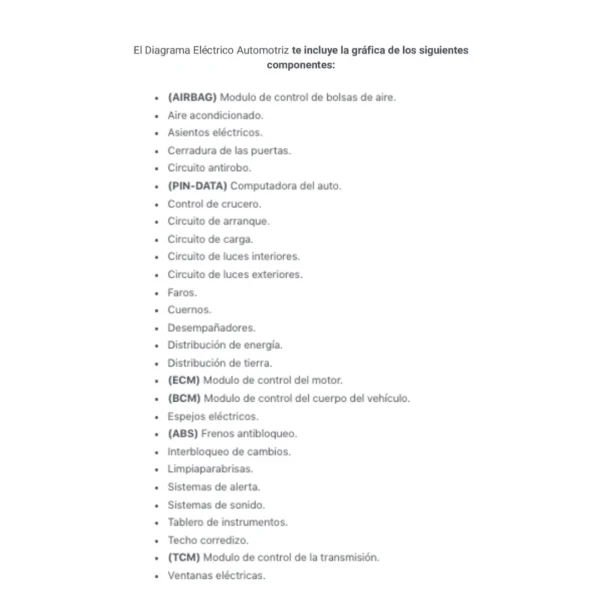 El Diagrama Eléctrico Automotriz te incluye la gráfica de los siguientes componentes: