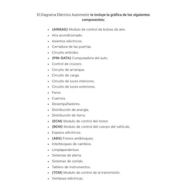 El Diagrama Eléctrico Automotriz te incluye la gráfica de los siguientes componentes: