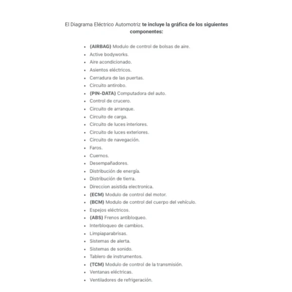 El Diagrama Eléctrico Automotriz te incluye la gráfica de los siguientes componentes: