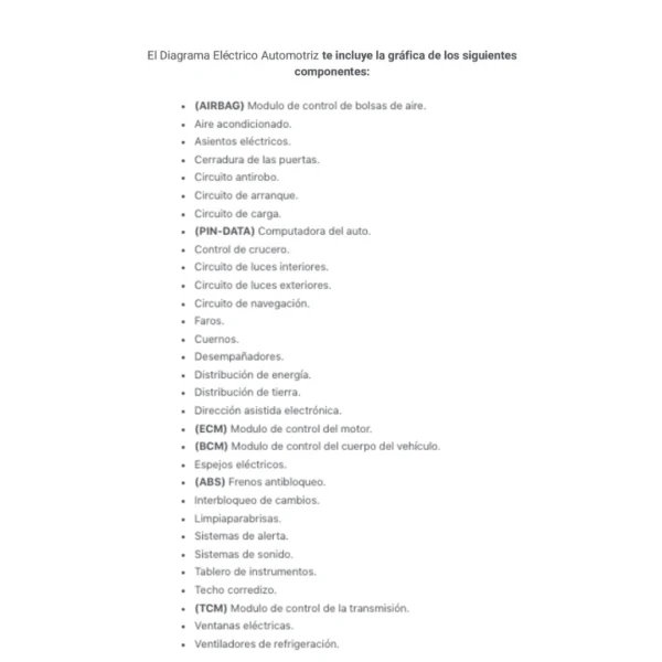 El Diagrama Eléctrico Automotriz te incluye la gráfica de los siguientes componentes: