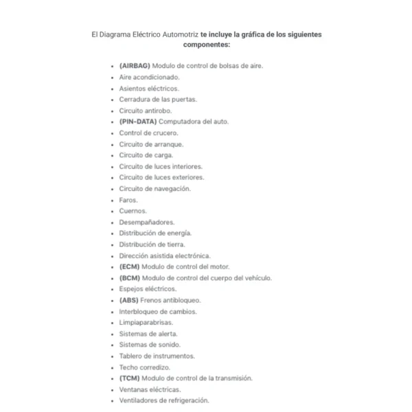 El Diagrama Eléctrico Automotriz te incluye la gráfica de los siguientes componentes: