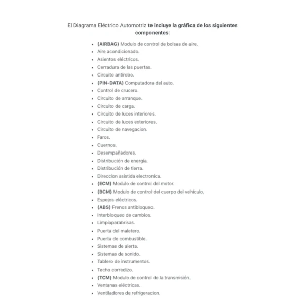 El Diagrama Eléctrico Automotriz te incluye la gráfica de los siguientes componentes: