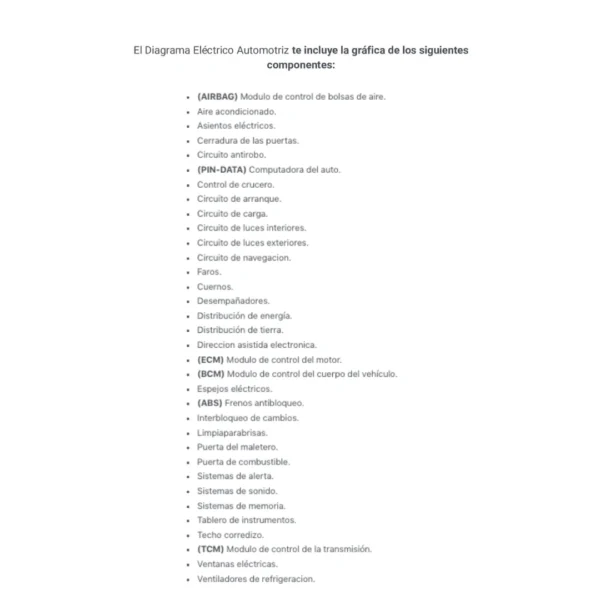 El Diagrama Eléctrico Automotriz te incluye la gráfica de los siguientes componentes: