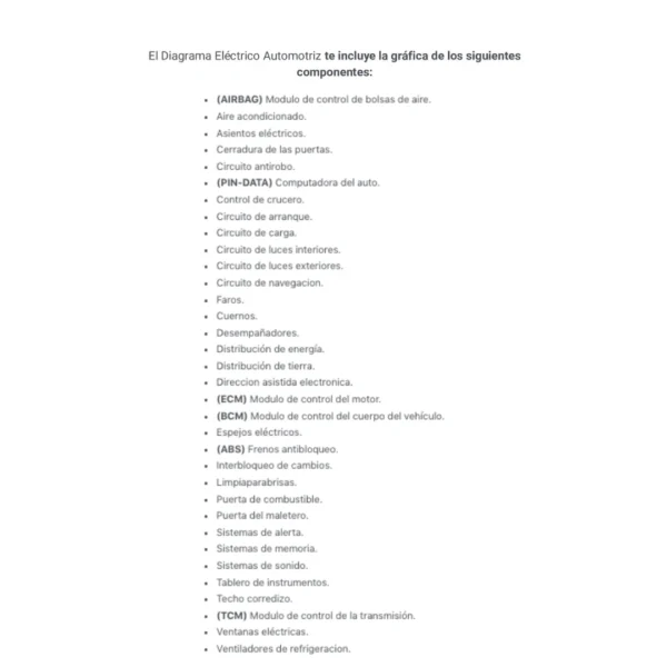 El Diagrama Eléctrico Automotriz te incluye la gráfica de los siguientes componentes: