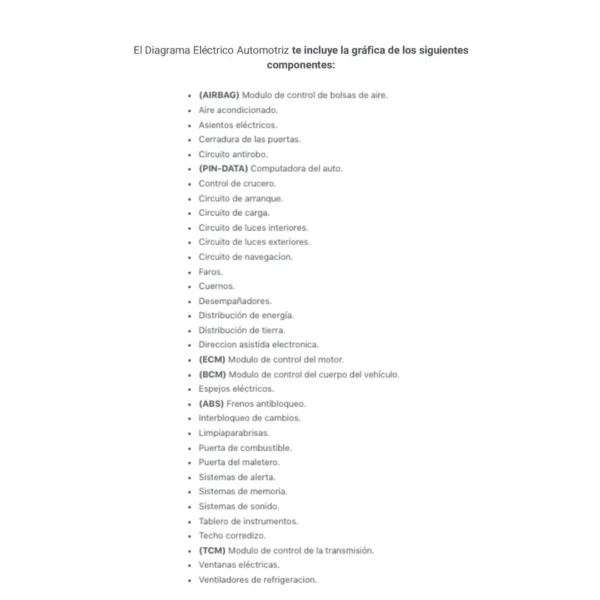 El Diagrama Eléctrico Automotriz te incluye la gráfica de los siguientes componentes: