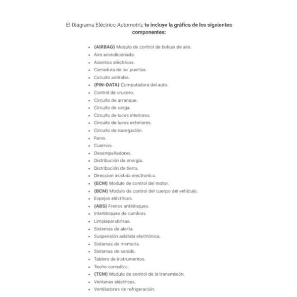 El Diagrama Eléctrico Automotriz te incluye la gráfica de los siguientes componentes:
