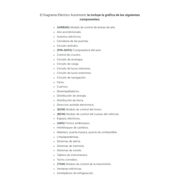 El Diagrama Eléctrico Automotriz te incluye la gráfica de los siguientes componentes: