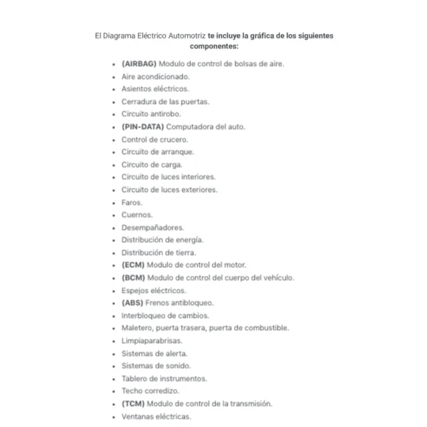 El Diagrama Eléctrico Automotriz te incluye la gráfica de los siguientes componentes: