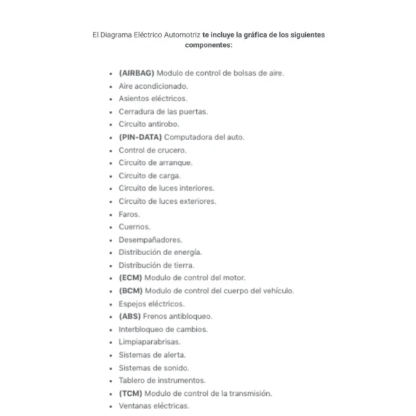 El Diagrama Eléctrico Automotriz te incluye la gráfica de los siguientes componentes: