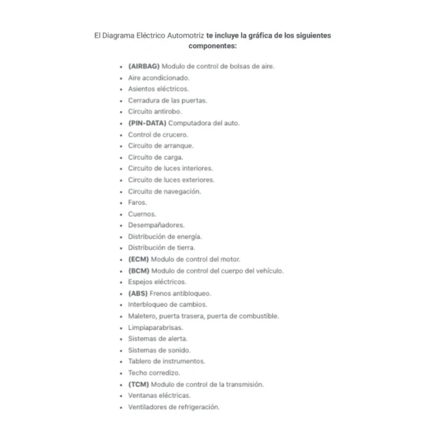 El Diagrama Eléctrico Automotriz te incluye la gráfica de los siguientes componentes: