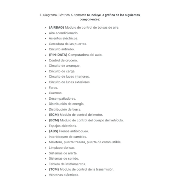 El Diagrama Eléctrico Automotriz te incluye la gráfica de los siguientes componentes: