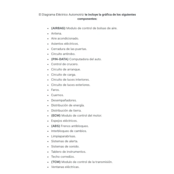 El Diagrama Eléctrico Automotriz te incluye la gráfica de los siguientes componentes: