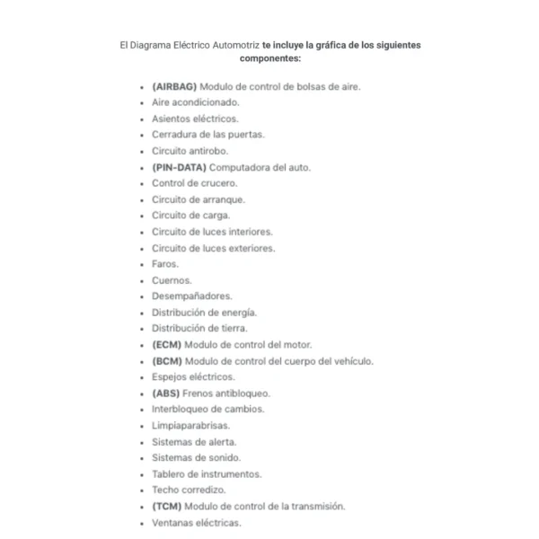 El Diagrama Eléctrico Automotriz te incluye la gráfica de los siguientes componentes: