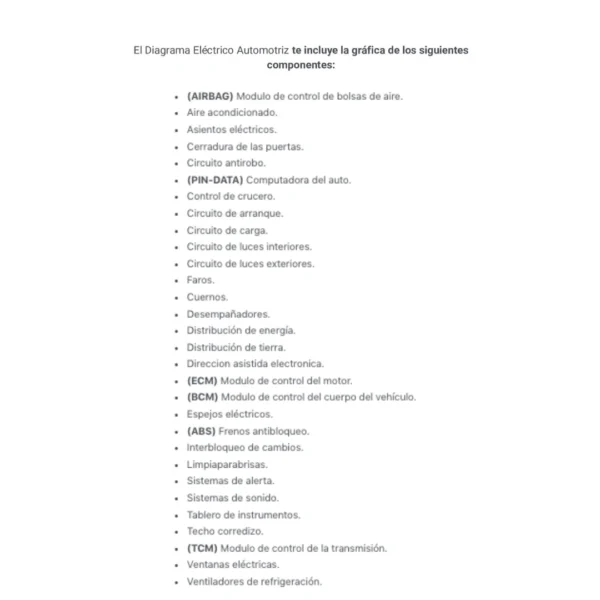 El Diagrama Eléctrico Automotriz te incluye la gráfica de los siguientes componentes: