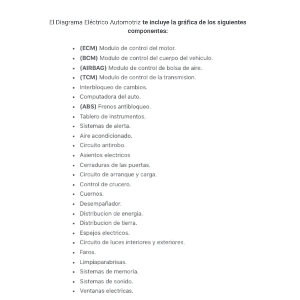 El Diagrama Eléctrico Automotriz te incluye la gráfica de los siguientes componentes: