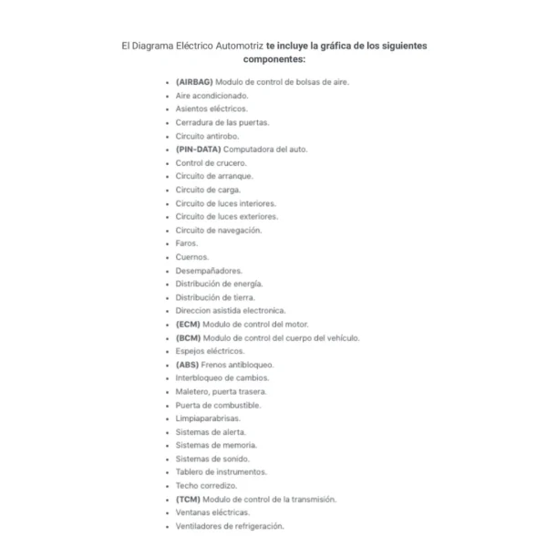 El Diagrama Eléctrico Automotriz te incluye la gráfica de los siguientes componentes: