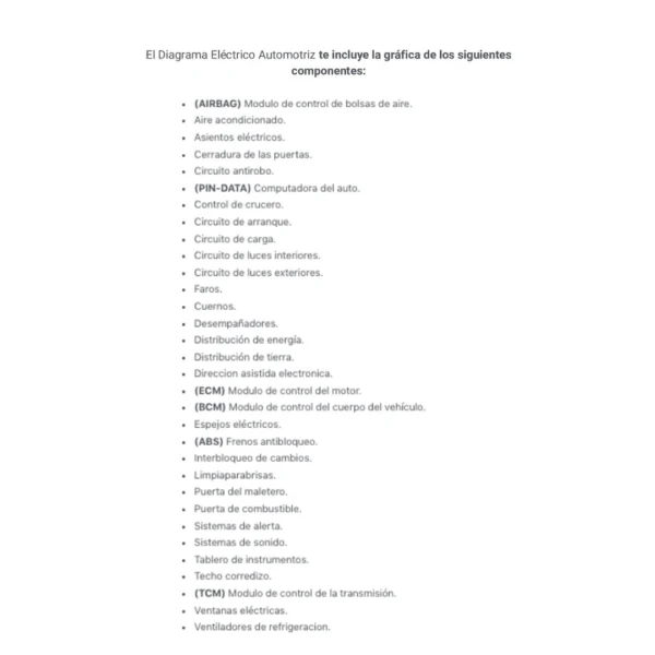 El Diagrama Eléctrico Automotriz te incluye la gráfica de los siguientes componentes: