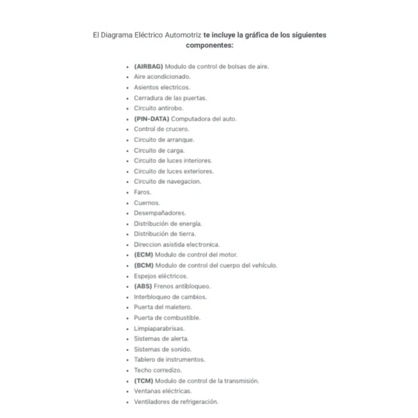El Diagrama Eléctrico Automotriz te incluye la gráfica de los siguientes componentes:
