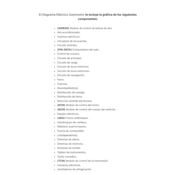 El Diagrama Eléctrico Automotriz te incluye la gráfica de los siguientes componentes: