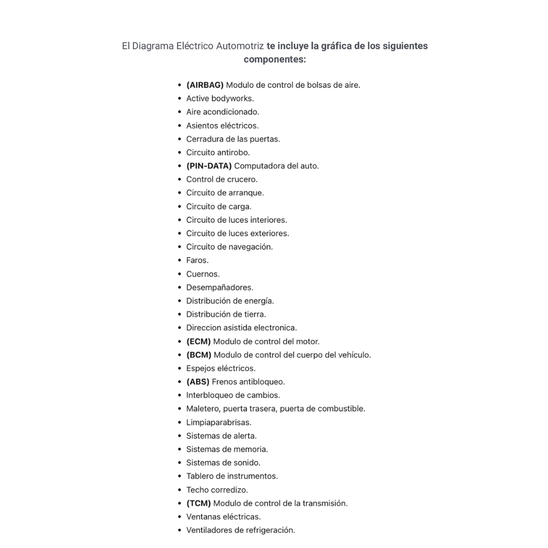 El Diagrama Eléctrico Automotriz te incluye la gráfica de los siguientes componentes: