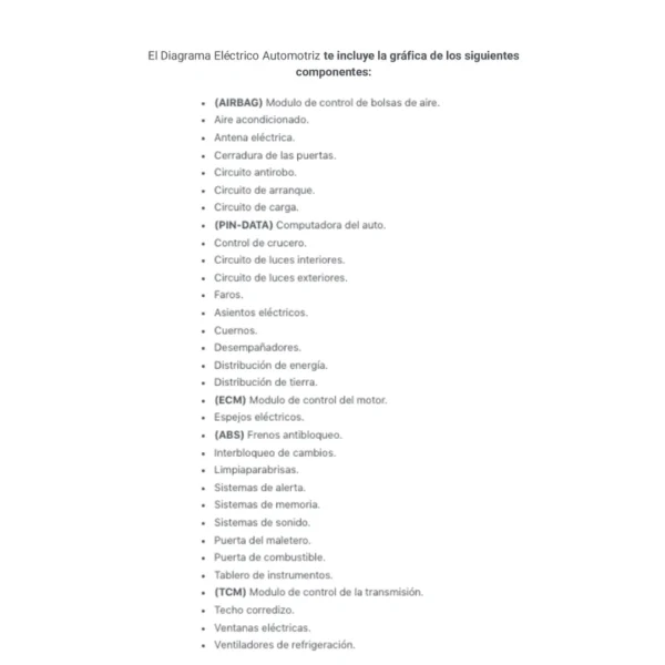 El Diagrama Eléctrico Automotriz te incluye la gráfica de los siguientes componentes: